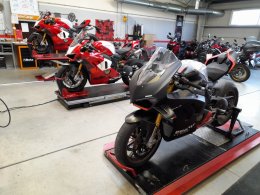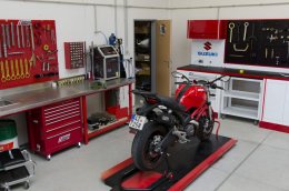 Vlastníme také osciloskop, díky kterému jsme schopni rychleji a přesněji diagnostikovat závadu motocyklu. Zabýváme se také měřením rámů, vidlic a kol s dokladem pro pojišťovnu. Zaměřujeme se na servis předních a zadních tlumičů: Marzocchi, Öhlins, WP, Showa, Kayaba, Sachs, Extreme Tech. Na servis tlumičů používáme špičkové nářadí Öhlins, Andreani - včetně vakuové pumpy SP3. V roce 2015 jsme se stali importérem dílenského vybavení italské značky LV8, náš servis je vybaven na míru - od LV8.